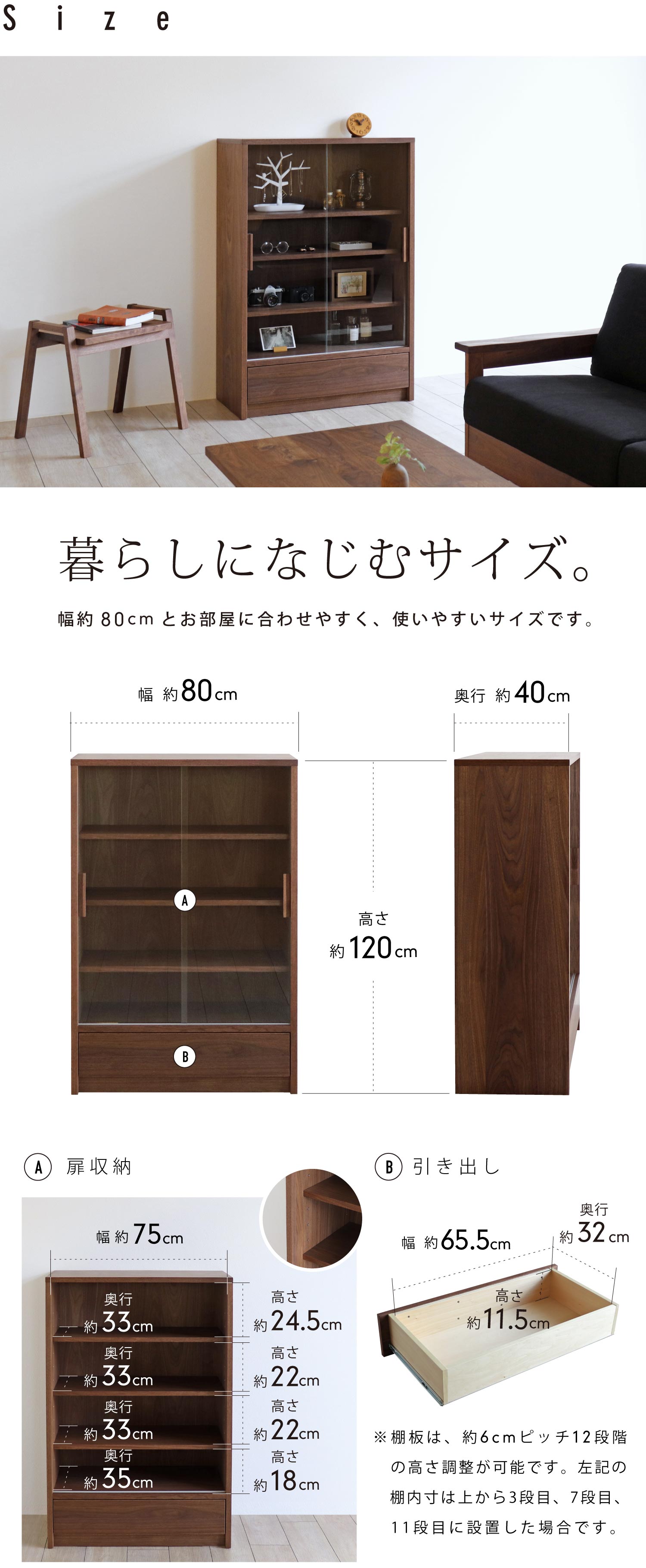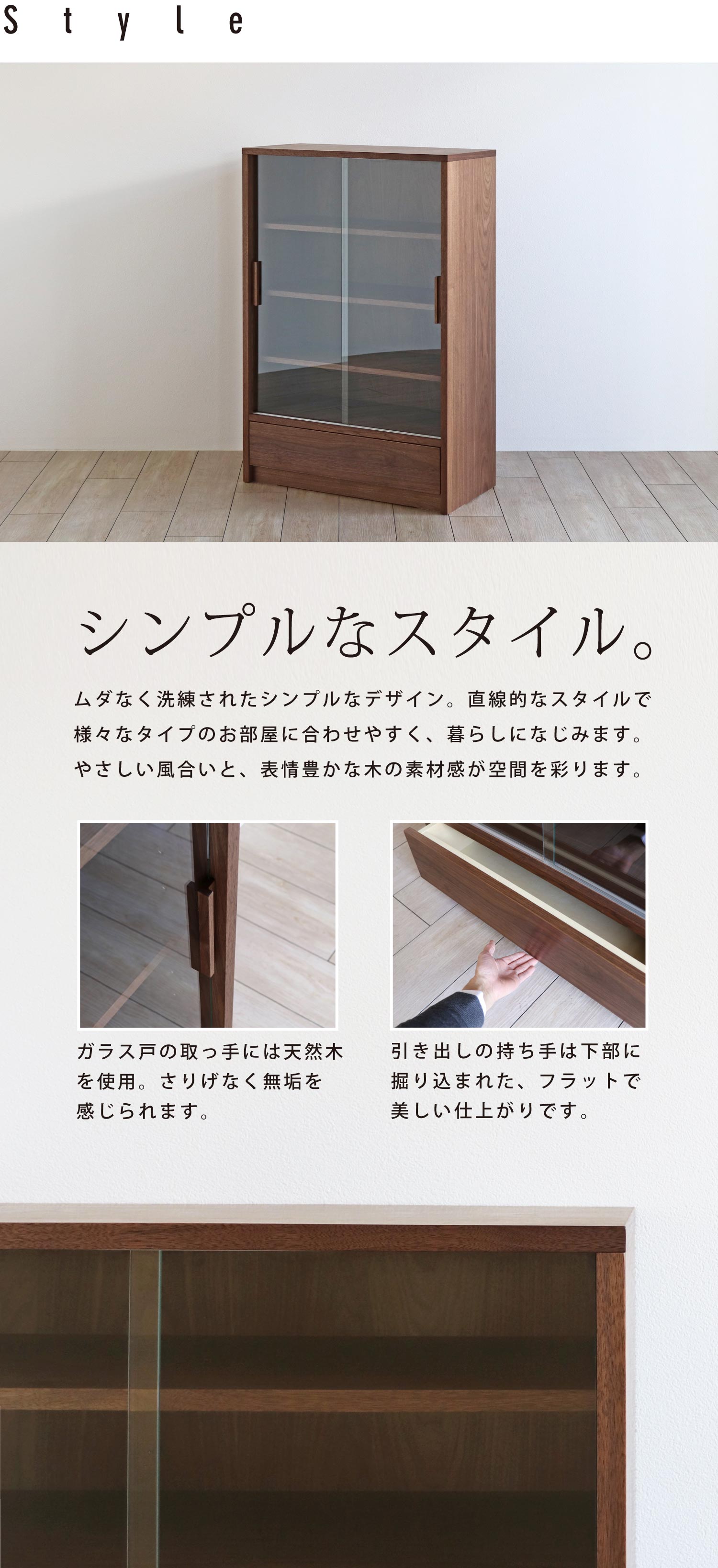 引き戸/クリアガラス(取っ手:ウォールナット無垢材) 引き出し前板/ウォールナット突板材 天板/ウォールナット突板材 側板/ウォールナット突板材 |