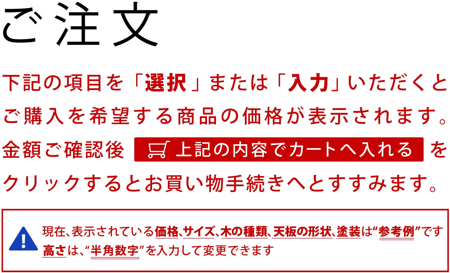 | 塗 装 | オイル ※同価格で、ウレタン塗装でもおつくり出来ます。 ※プラス¥6,930(税込)でセラウッド塗装が可能です。 ※ニレ材はウレタン塗装のみ対応です。 >詳しくは「塗装について」をご覧ください |