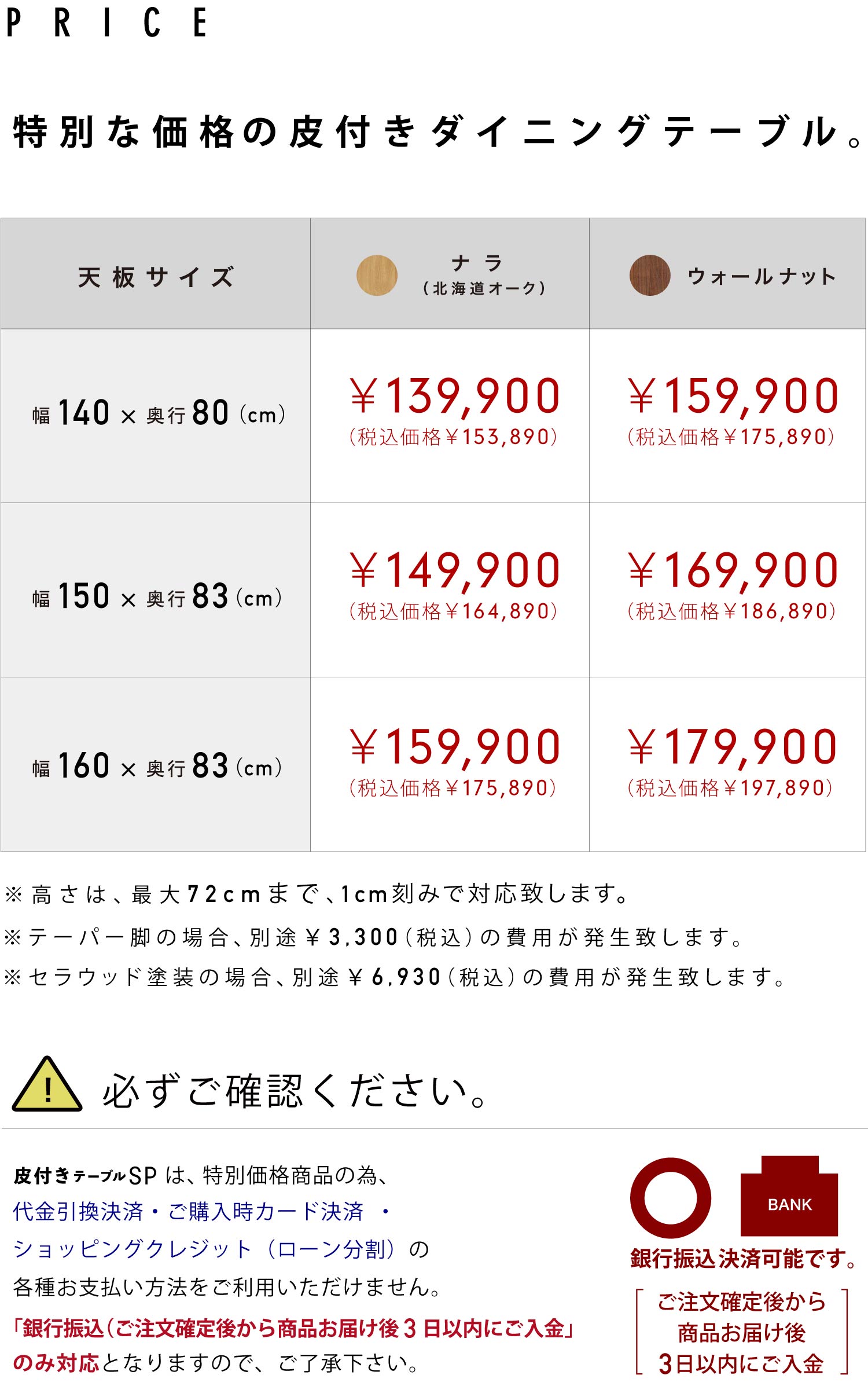 ▼ナラ(北海道オーク) ¥139,900〜 (税込価格 ¥153,890〜) ▼ウォールナット ¥159,900〜 (税込価格 ¥175,890〜) ※木の種類、サイズ、脚の形状、塗装によって価格が異なります。 詳しくは、上記価格表をご覧ください。 |