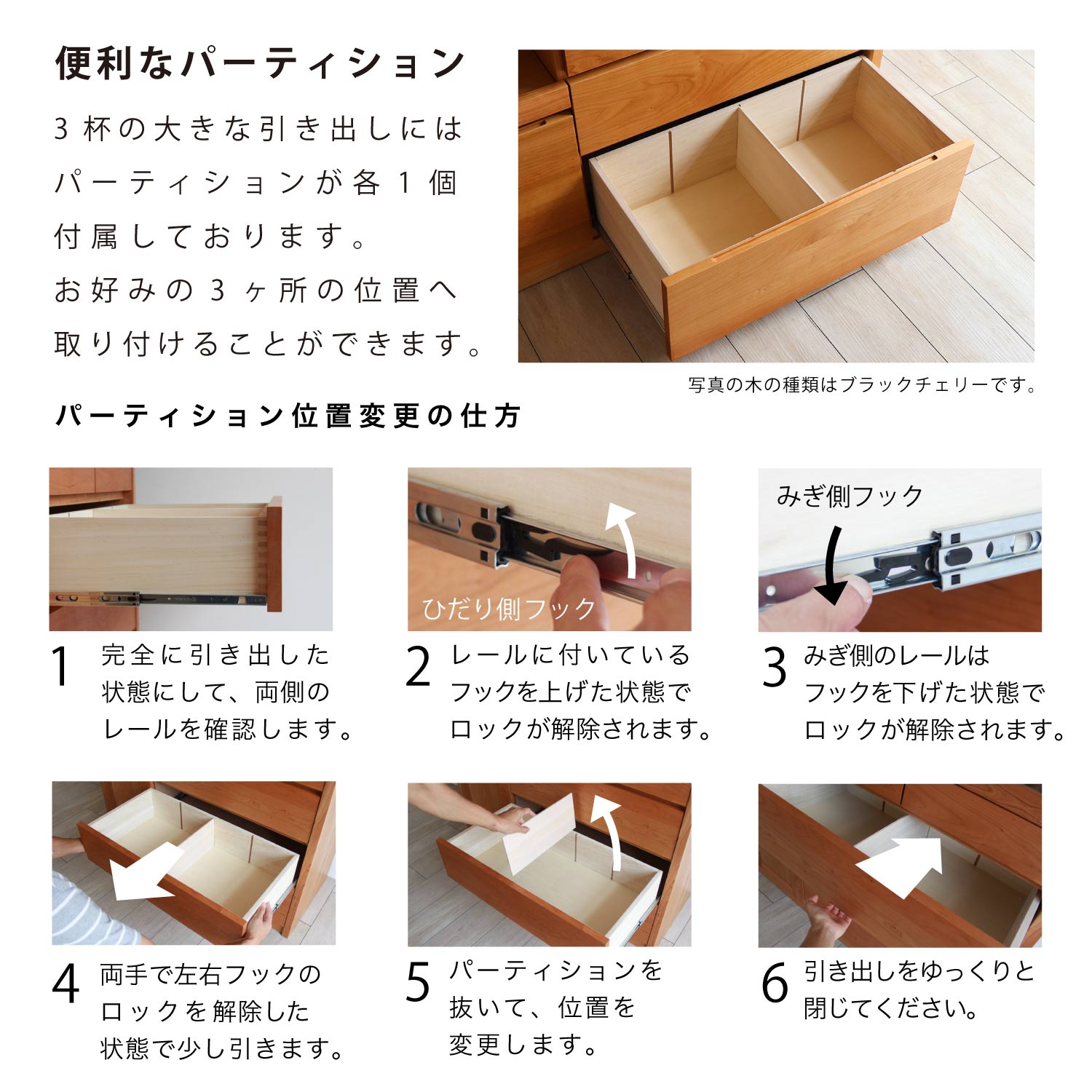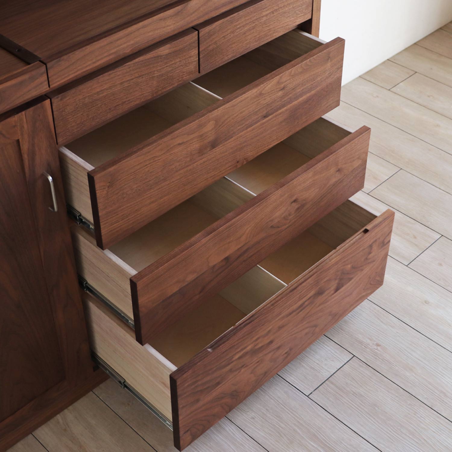 | 仕 様 | 前板/ウォールナット無垢材 側板/ウォールナット突板材 棚板/ウォールナット突板材 引き出し内部/桐材 オープンスペース上/モイス材(湿気を調整する天然素材) 背面/化粧合板 |