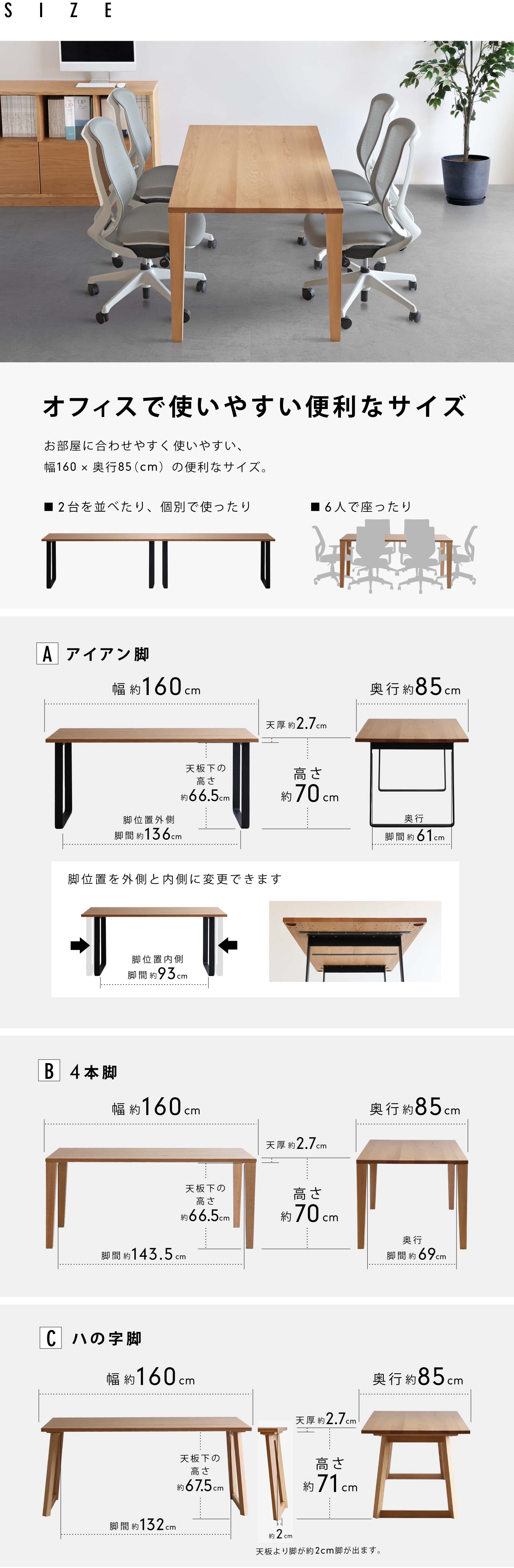 | サイズ | 幅:約160×奥行:約85×高:約70 (cm) 脚の形状B:ハの字は高さが約71 (cm)です 天板の厚み:約27 (mm) |