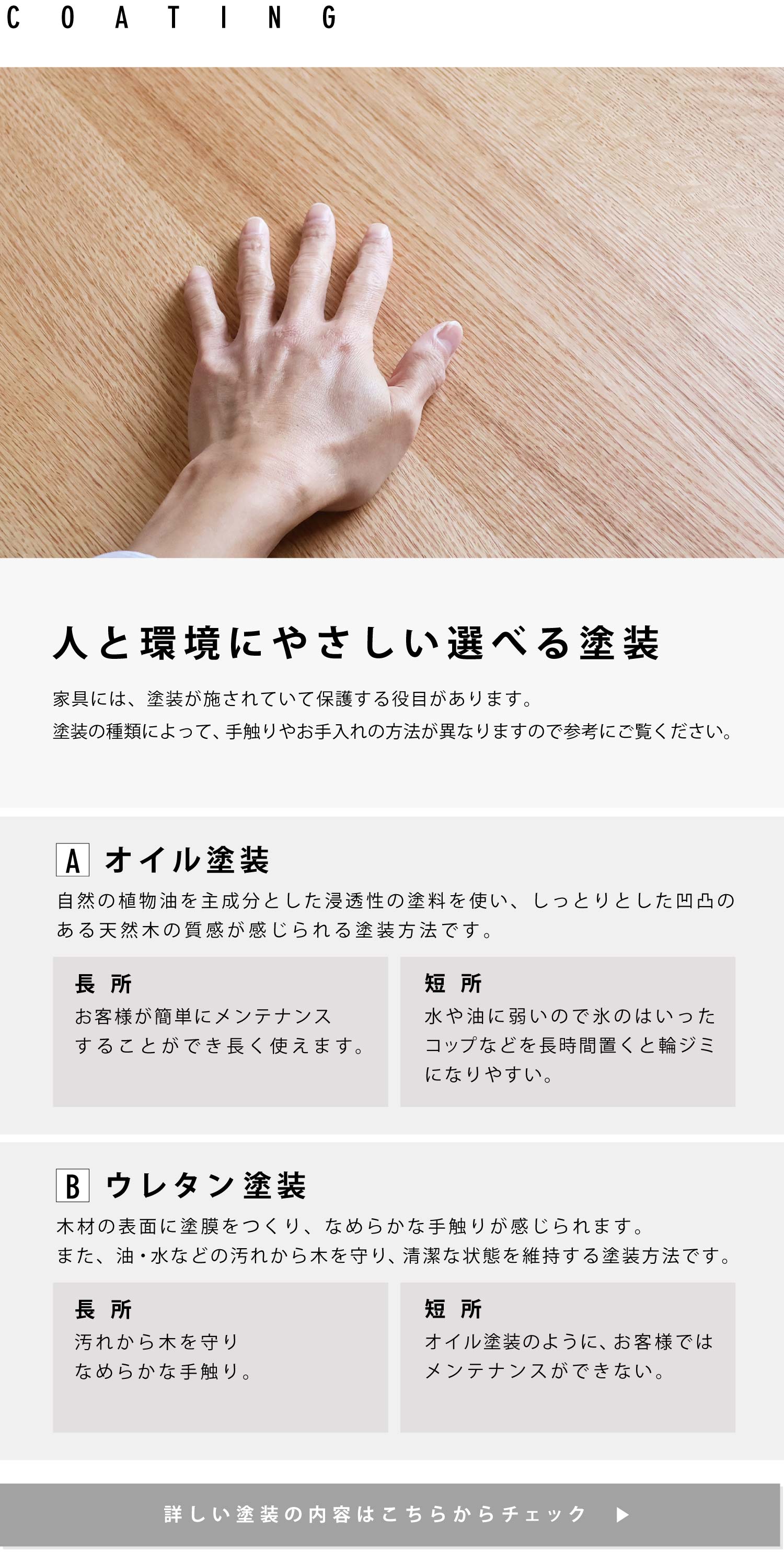 | 塗 装 | オイル ※同価格で、ウレタン塗装でもおつくり出来ます。 >詳しくは「塗装について」をご覧ください |