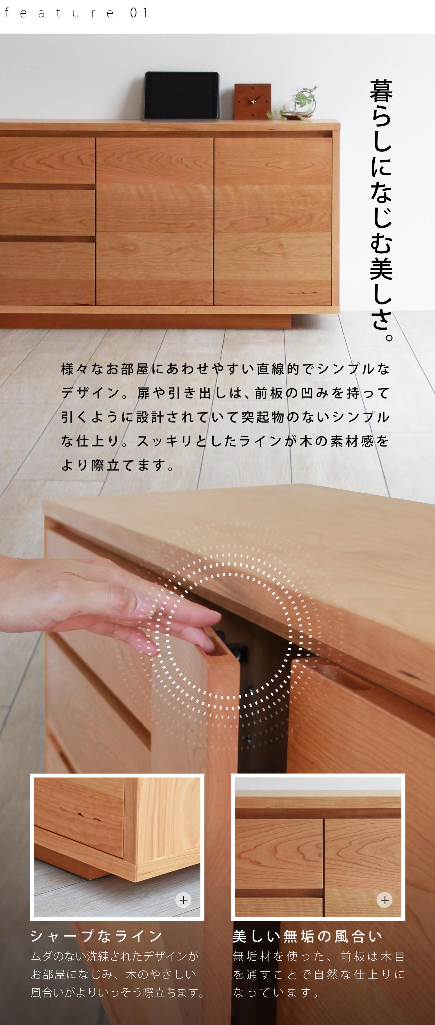 | 仕様 | 前板/ブラックチェリー無垢材 天板/ブラックチェリー突板材 側板/ブラックチェリー突板材 引き出し内部/桐材 |