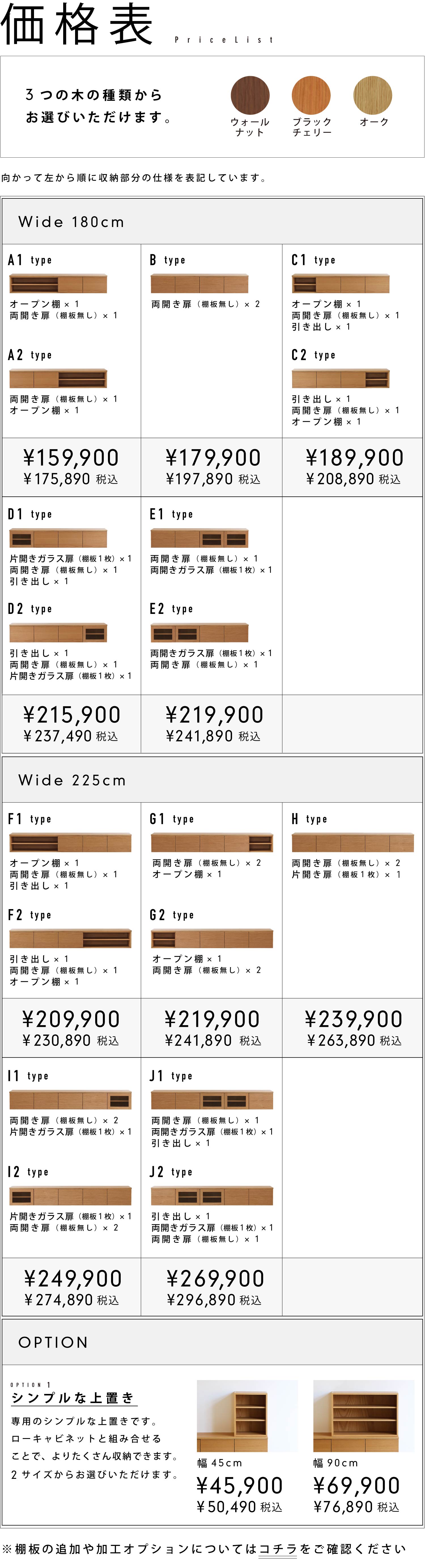 ▼幅:約180cm ¥159,900〜 (税込価格 ¥175,890〜) ▼幅:約225cm ¥209,900〜 (税込価格 ¥230,890〜) ※サイズ、収納タイプ、加工の有無により価格が異なります。 詳しくは、下記価格表をご覧ください。 |